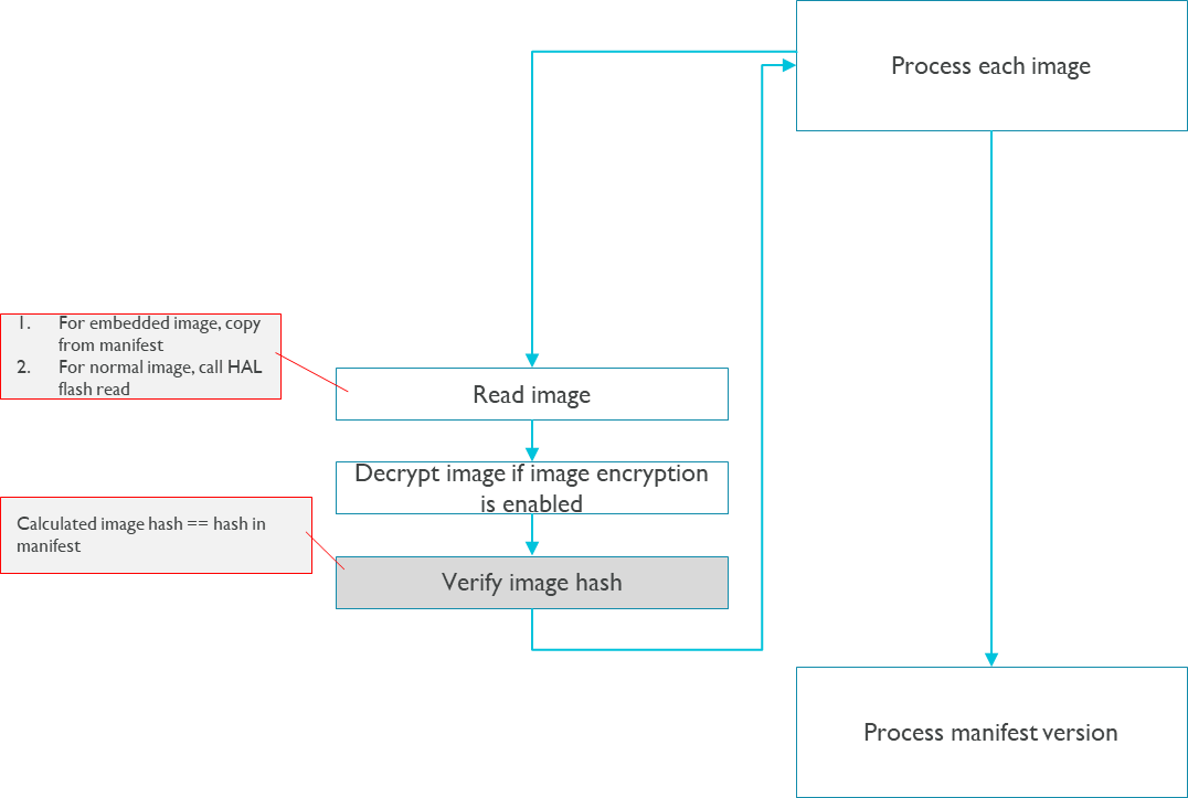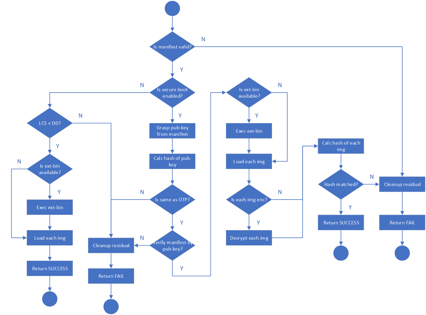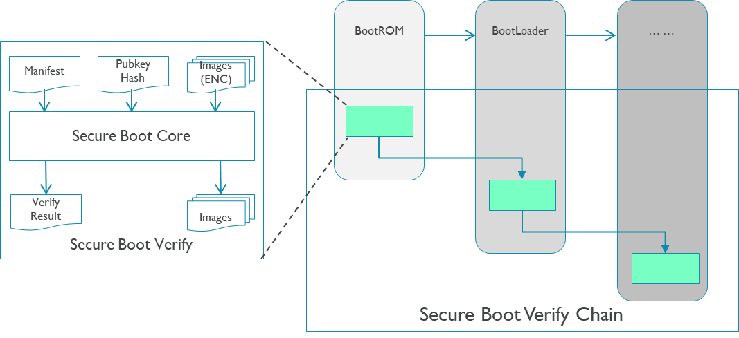 Secure boot core runs on device, it verifies the manifest and images. There is hardware adaption layer (HAL) to port the secure boot core to different software environments, such as BootROM, bootloader.