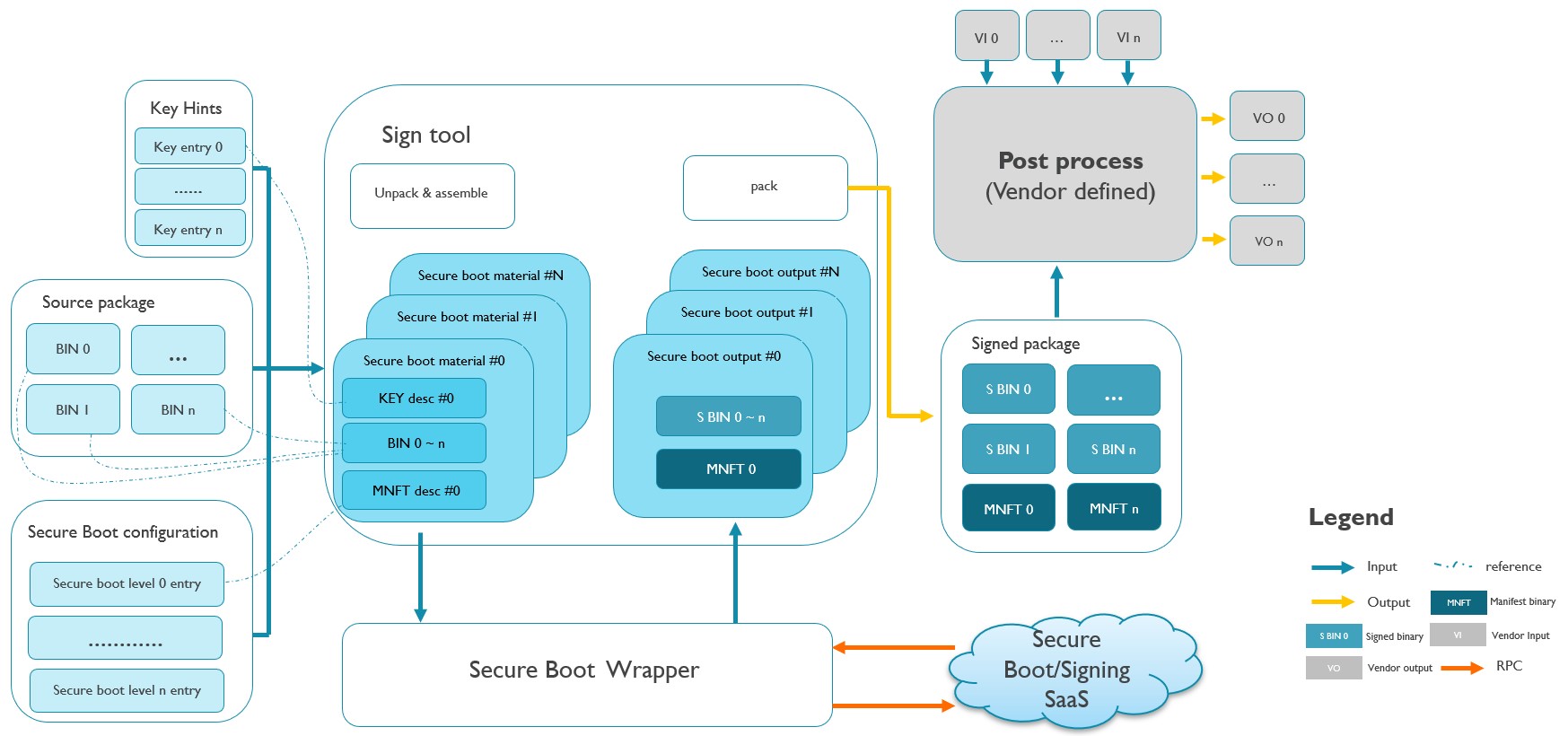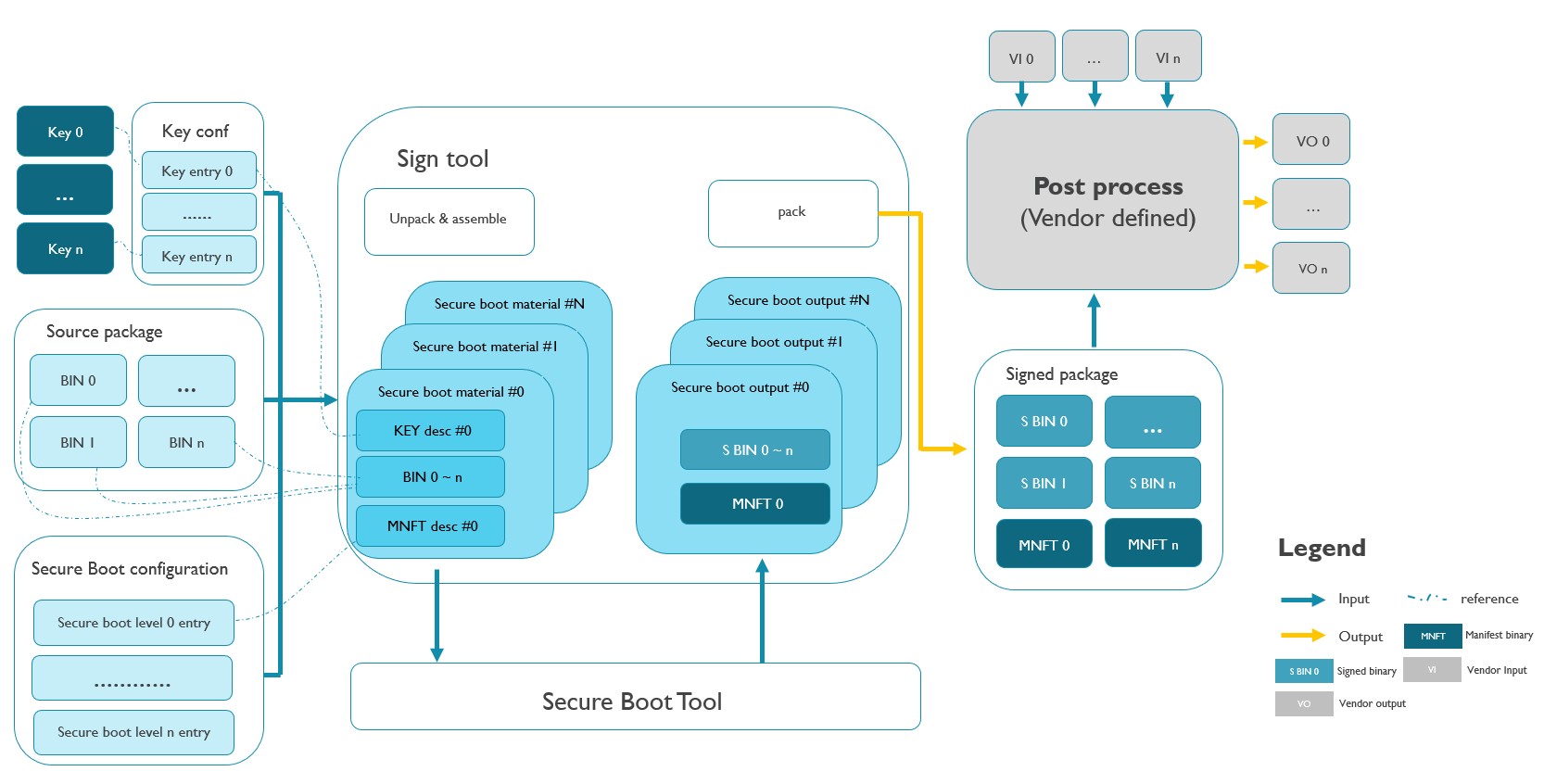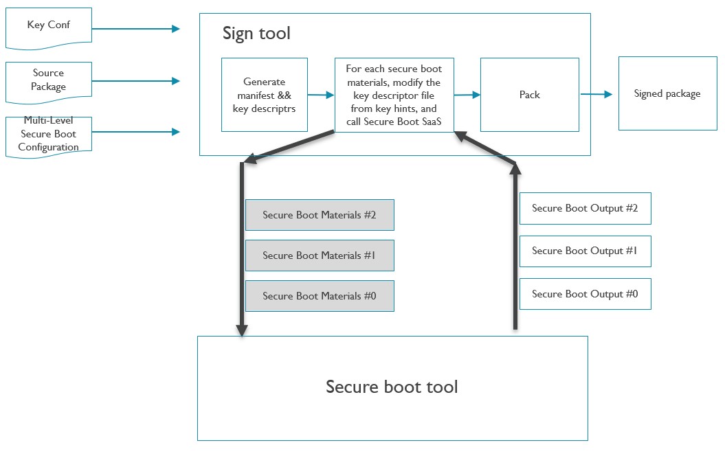 Signing tool extracts the input source package, parses the multi-level secure boot configuration file and input key configuration file or key hints file, and generates several manifest/key descriptor files. Details about source package see section 4.8 signing tool.