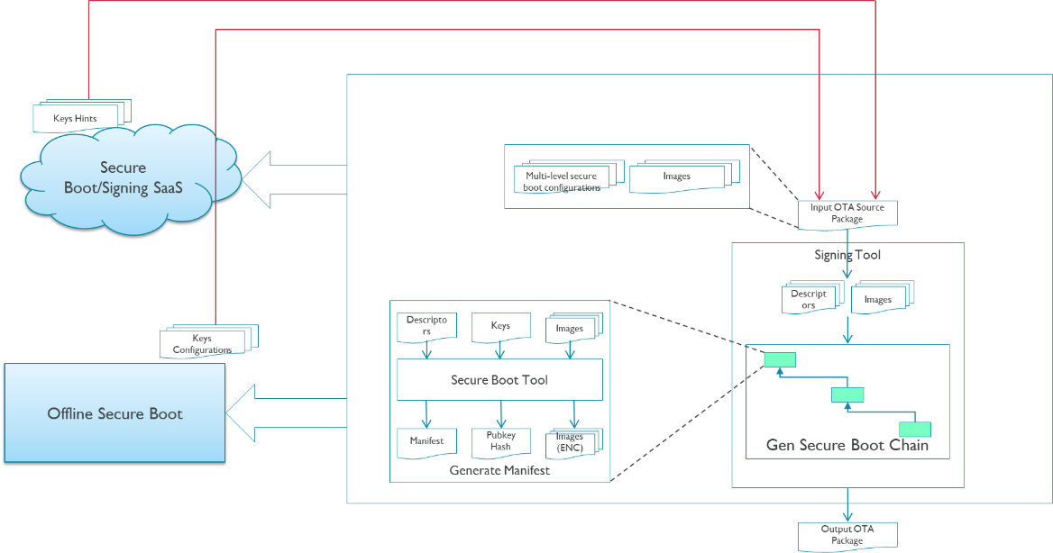 The signing SaaS or offline signing tool replaces the new keys via key configuration file or key hints file. The keys include secure boot signing keys, model key (used by image encryption).