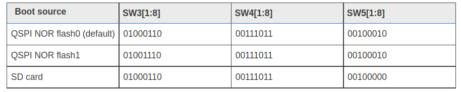 SW3 = 01001110,SW4 = 00111011,SW5 = 00100010Program QSPI NOR flash0 from QSPI NOR flash1: