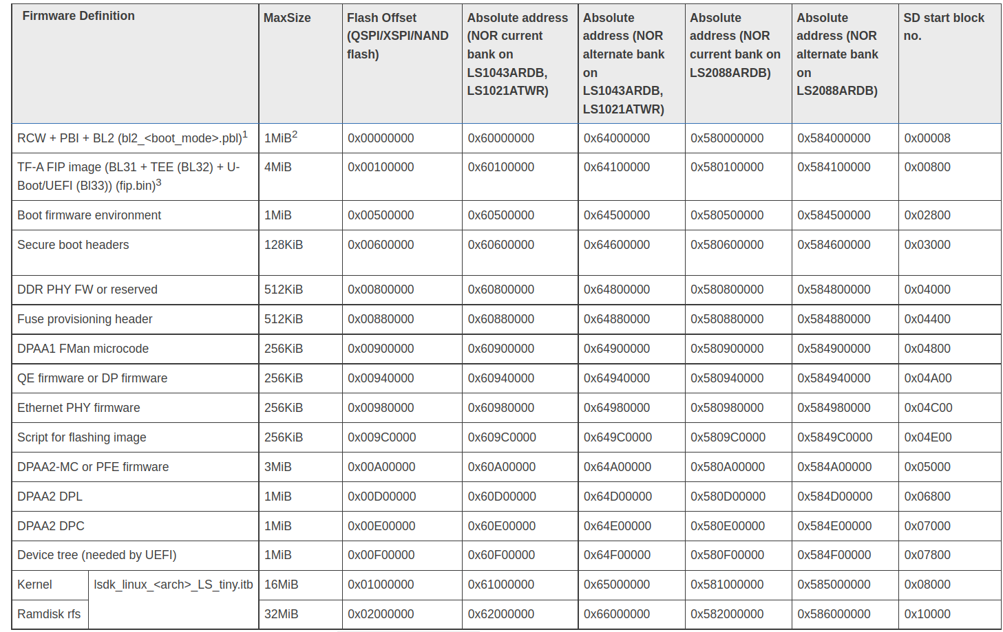 The following table shows the memory layout of various firmwares stored in NOR/NAND/QSPI/XSPI flash device or SD card on all Layerscape Reference Design Boards.