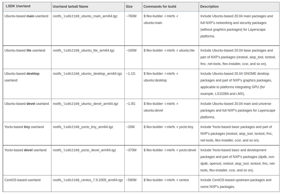 If you want to build specific userland from source, refer to the section "How to build LSDK with Flexbuild" -> "How to build various userland with custom packages" for the detailed steps to build various userland.