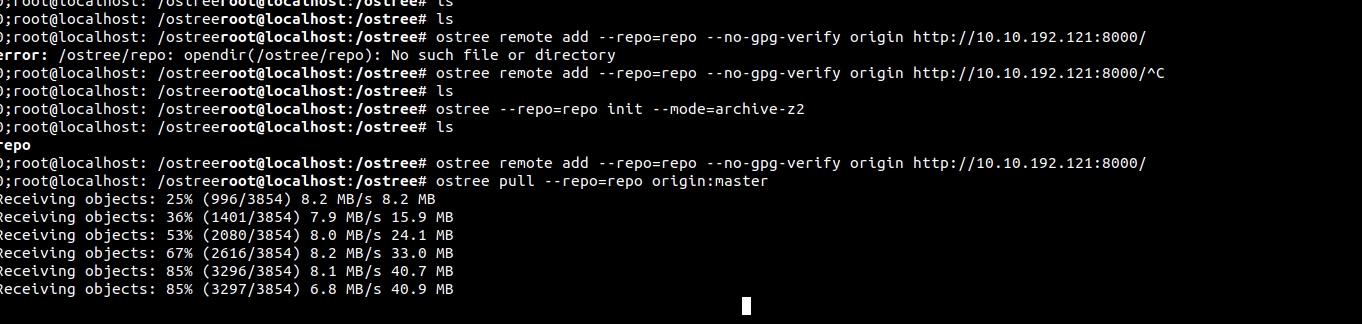 `ostree remote add --repo=repo --no-gpg-verify origin http://10.10.192.121:8000/