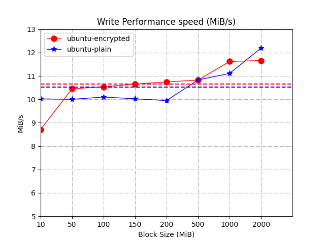 Unencrypted vs. Encrypted 3.3% faster. The test results are almost consistent with those in this wiki (write + read) / 2 is (6.5% + 0%) / 2 = 3.25%.