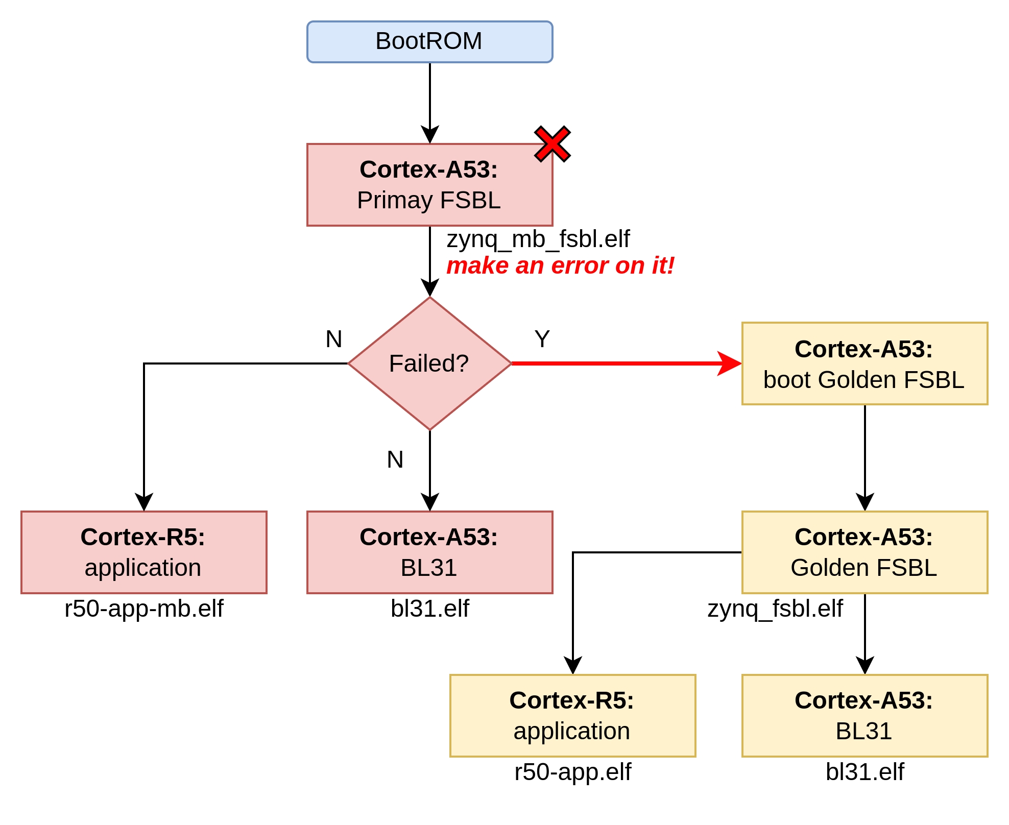 FSBL Fallback 为了从错误条件中恢复,FSBL 做了一个回退(Fallback),使 BootROM 能够加载另一个可引导镜像 (最初出现并处于已知良好状态的 golden image),如果该镜像存在于闪存中。FSBL 更新一个 Multiboot 寄存器并进行软复位,以便 BootROM 执行并加载下一个当前有效的镜像。无论是否软复位,FSBL 都可能发生回退。