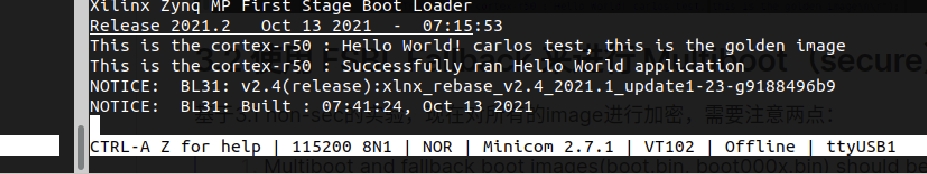 实验判定:当ZYNQ启动之后,串口输出log为"golden image" 证明启动进入goledn image成功。