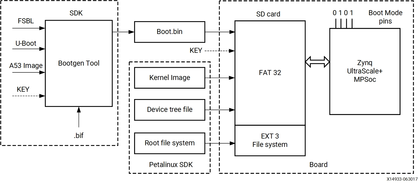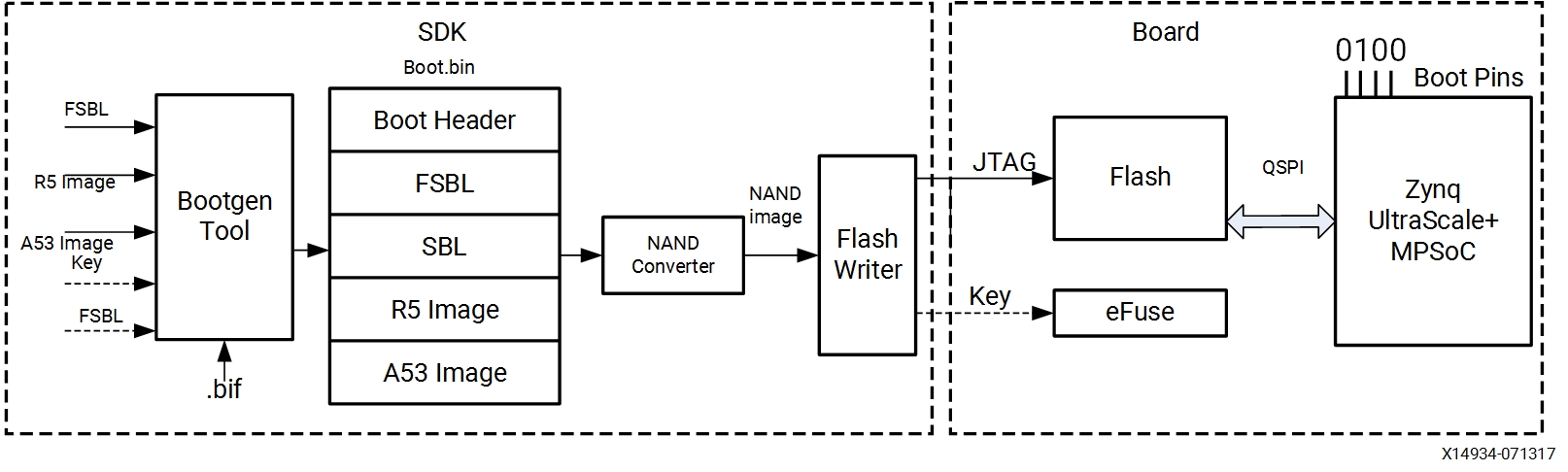 需要注意的事,boot.bin需要经过NAND Converter转换为NAND image( flash writer),看图中这部分应该是集中在SDK中。最后通过JTAG的方式把 boot.bin写入 FLASH,而密钥需要写入efuse。