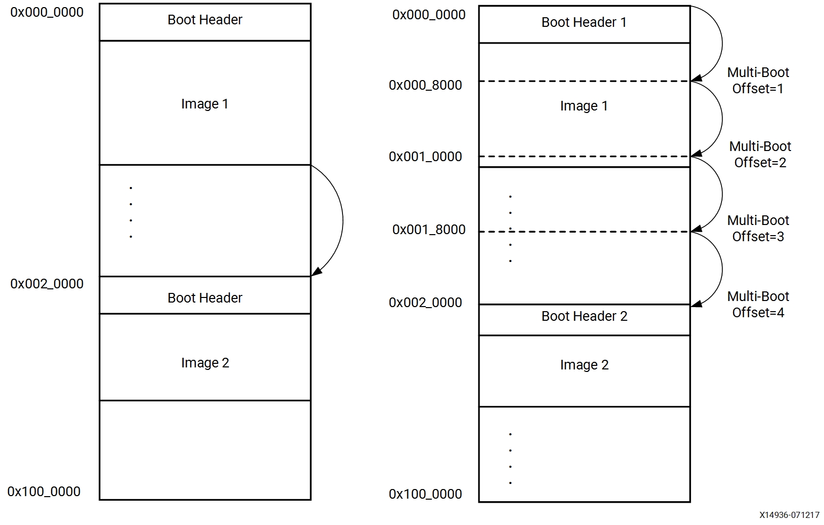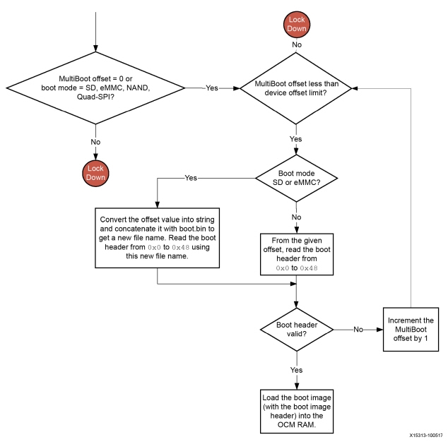 BootROM Multiboot 这是由 FSBL 发起的,也就是 user。如果 BootROM 找到了一个有效的头文件并交给 FSBL,那么 FSBL 可以加载 Multiboot 寄存器并发出软复位。软复位后,BootROM 将使用 Multiboot 寄存器的地址来读取 BootROM 头文件。例如,当用户想要运行自检和诊断,然后跳转到实际的应用程序时,就会使用这种机制。