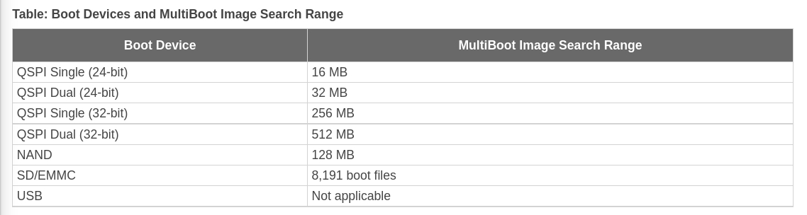 Note: QSPI dual stacked (x8) boot is not supported. Only QSPI Single Transmission Rate (STR) is supported**. Single Quad-SPI memory (x1, x2, and x4) is the only boot mode that supports execute-in-place (XIP)**.