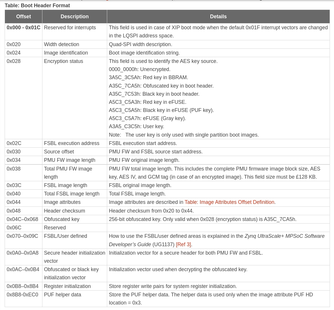 ZYNQ提供一个bootgen的工具,这个工具主要就是把二进制文件缝合在一起,还可以配置一些属性、特性和参数。更重要的是,secure boot的使能也是通过bootgen tool,喂给bootgen tool公钥私钥。bootgen tool还能提供指定目的地址,对齐的需求。(关于认证流程和密钥管理的在Using HSM Mode中讨论 https://docs.xilinx.com/r/en-US/ug1283-bootgen-user-guide/Encryption-and-Authentication )。 bootgen还可以同步输出一些hash文件,这些hash文件可以使用私钥进行签名做一些离线验证。最后bootgen工具会把所有的二进制文件都打包成为image,并且加入了描述的头文件(包含所有的分区)