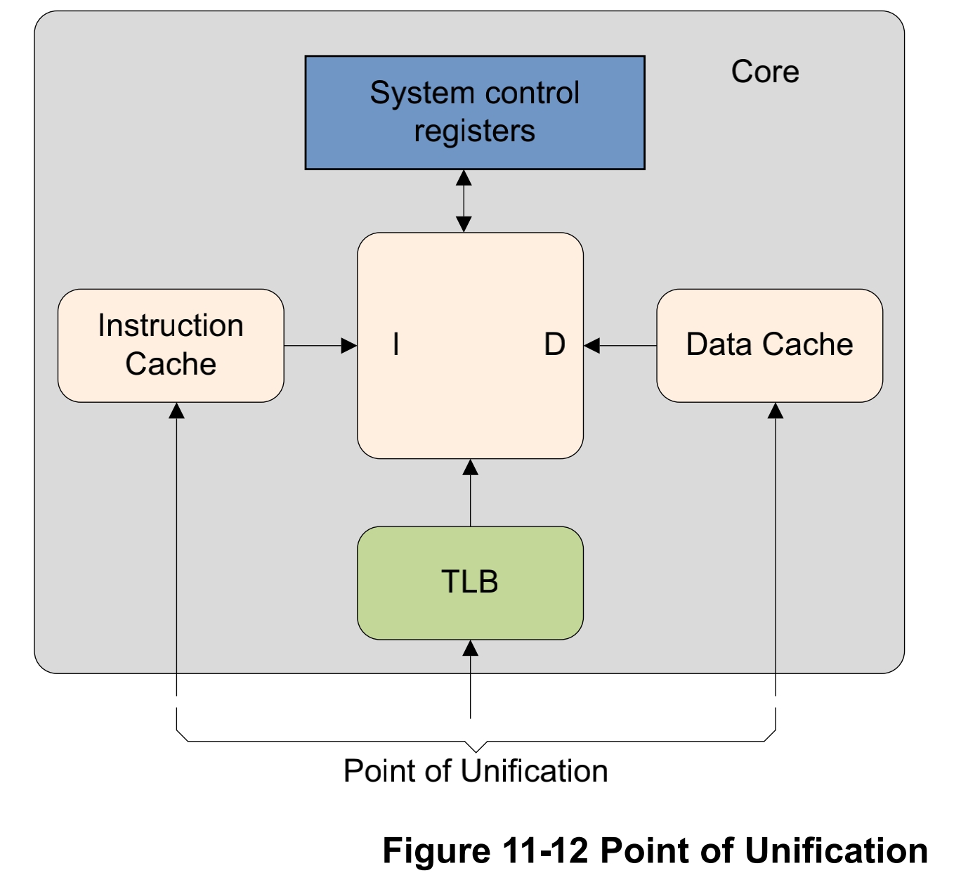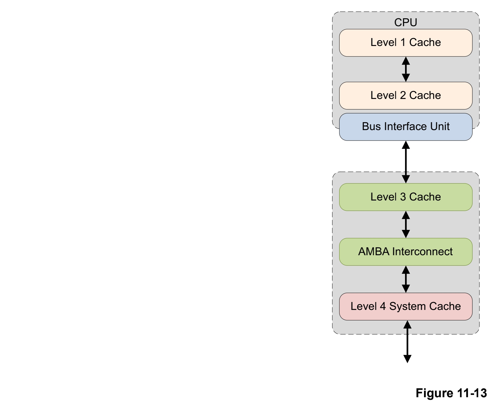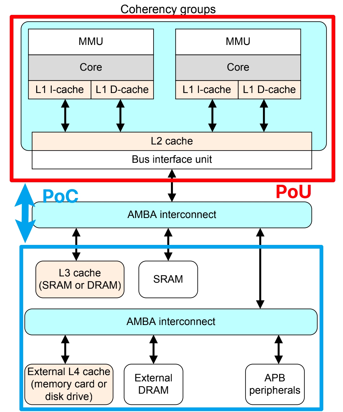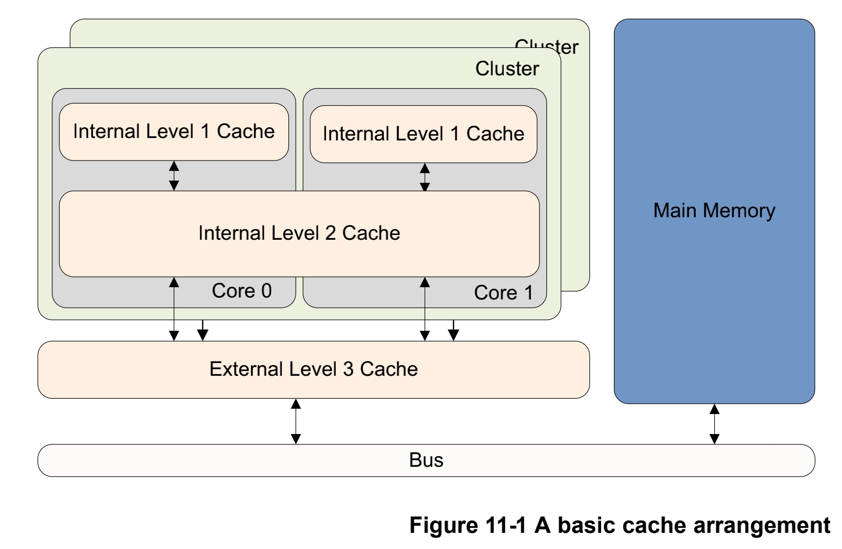 在ARMv8-A的体系架构中的处理器通常会实现超过2级的cache,这也是经典处理器的做法,L1设定一个比较小的core独享的d-cache和i-cache,L2设定一个相比于L1要大的cache,且在L2由多个cores(集群)共享,在Cortex-A53和A72就是这样的设定。除此之外,还需要注意,在一些ARM中还会布置一个外部的L3 cache作为一个硬件模块,也是有多个cores共享。
