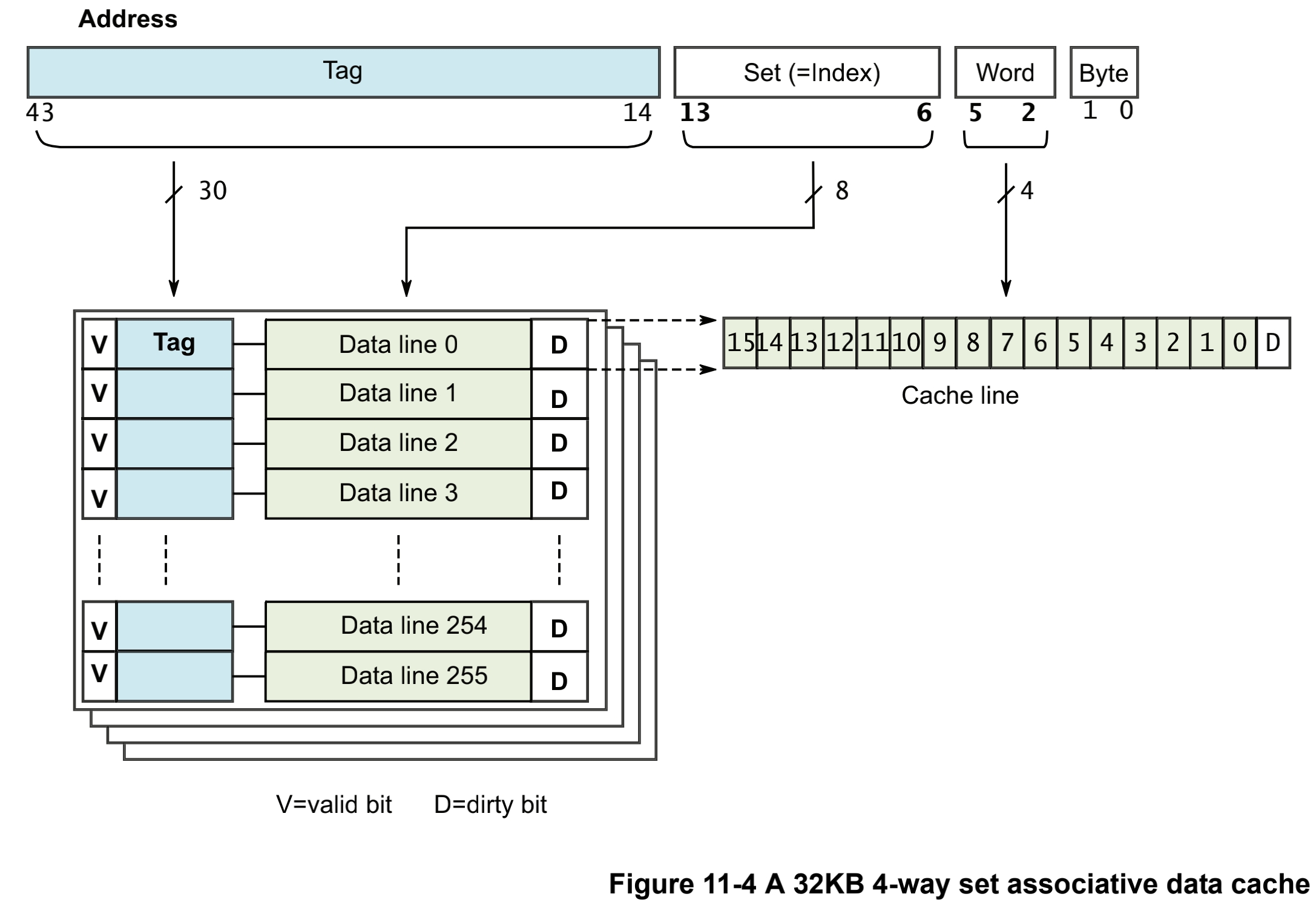 ARM的cache采用组相联的结构。这就意味着对于一个给定的地址,cache可能映射在多个位置(再通过tag来识别映射在哪个位置)。组相联的cache可以有效减缓cache抖动,也可以提升程序的执行速度,这样做的缺点就是增加了硬件的复杂度,间接地,提升了arm处理器的功耗。以Cortex-A53为例子,Cortex-A53提供了32KB的L1-D-Cache,4-way,16word(64bytes)长度的cache line,注意,这里说的cache line的长度,不是总长度,而是数据的长度。如图所示: