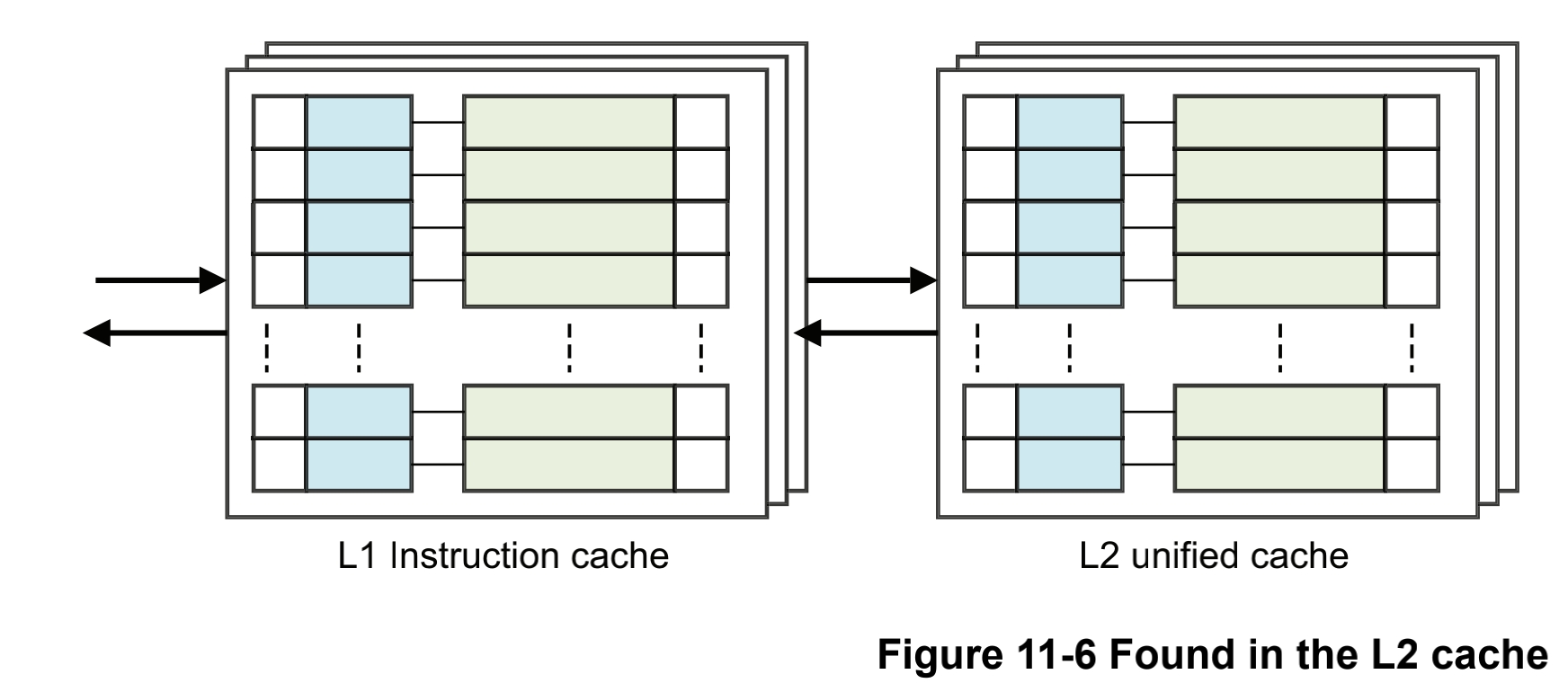如果数据在L1中没有发现,但是在L2中,数据就会从L2被加载到L1,然后返回给core。从L2返回L1的时候,可能会让L1驱逐出一个cache line以腾出一行的空间容纳L2加载过来的数据,而且这个数据可能依然还会存在于L2之中。