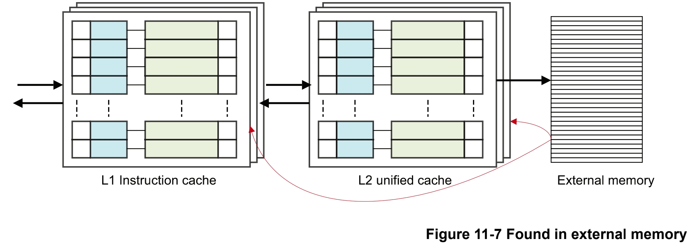 如果数据都没有在L1和L2中,数据查找就会转向外存中,外存把数据加载到L2,再从L2加载到L1,最后从L1传递到core。这时候在L2和L1层级都发生了cache line的驱逐,数据保存在外存,L2,L1上面。