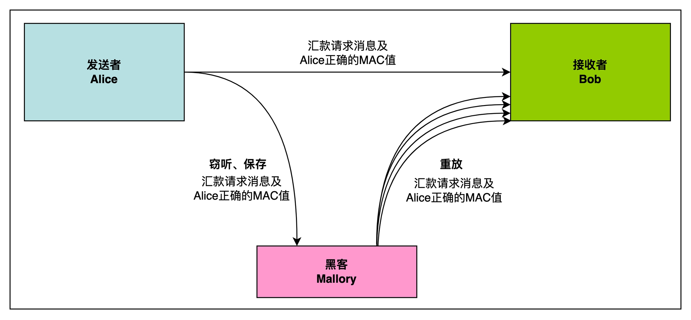 对于抵抗重放攻击,我们通常有以下手段,本质上都是让每次的MAC值发生变化,即便是Mallory拿到了某一次的MAC值,也无法进行重放攻击。